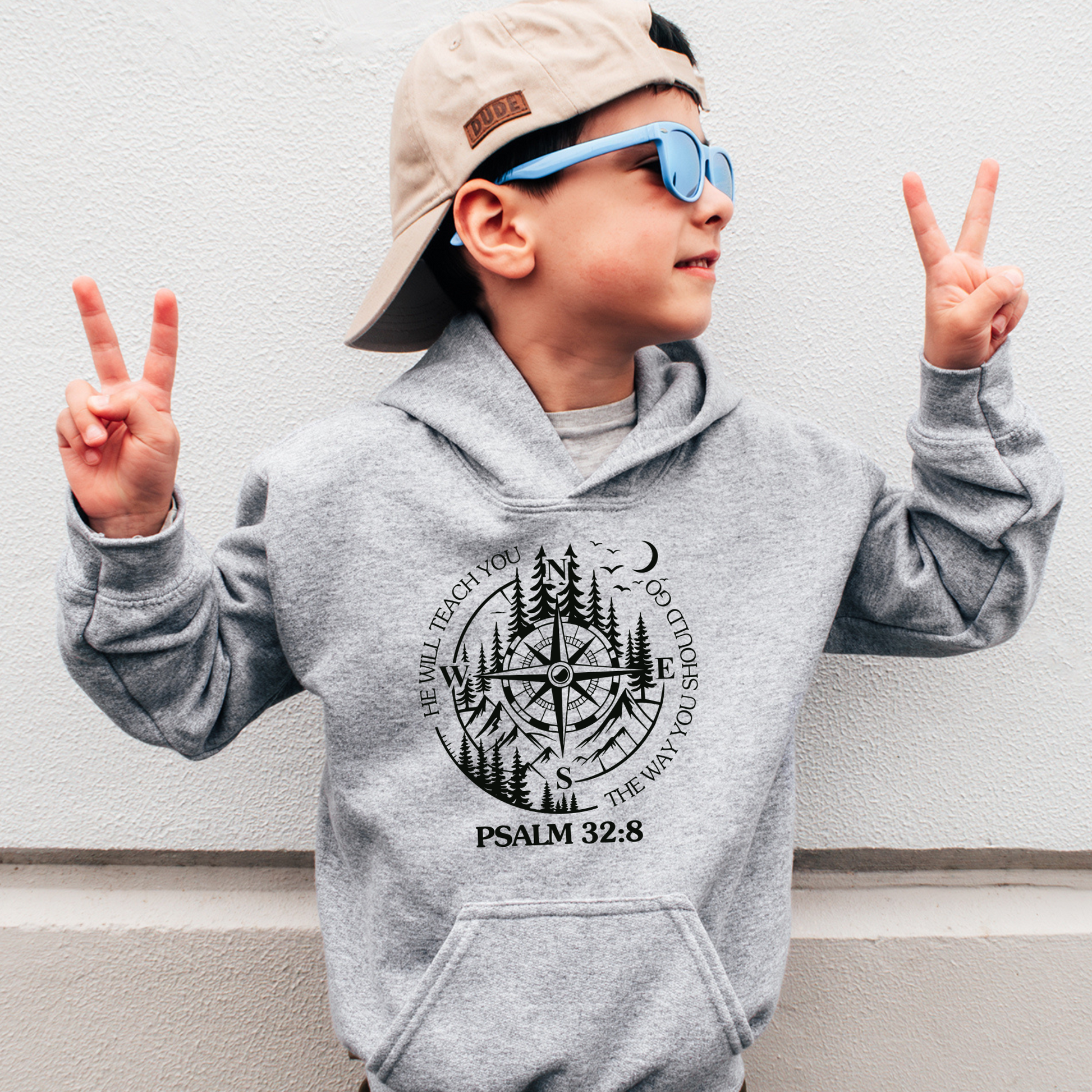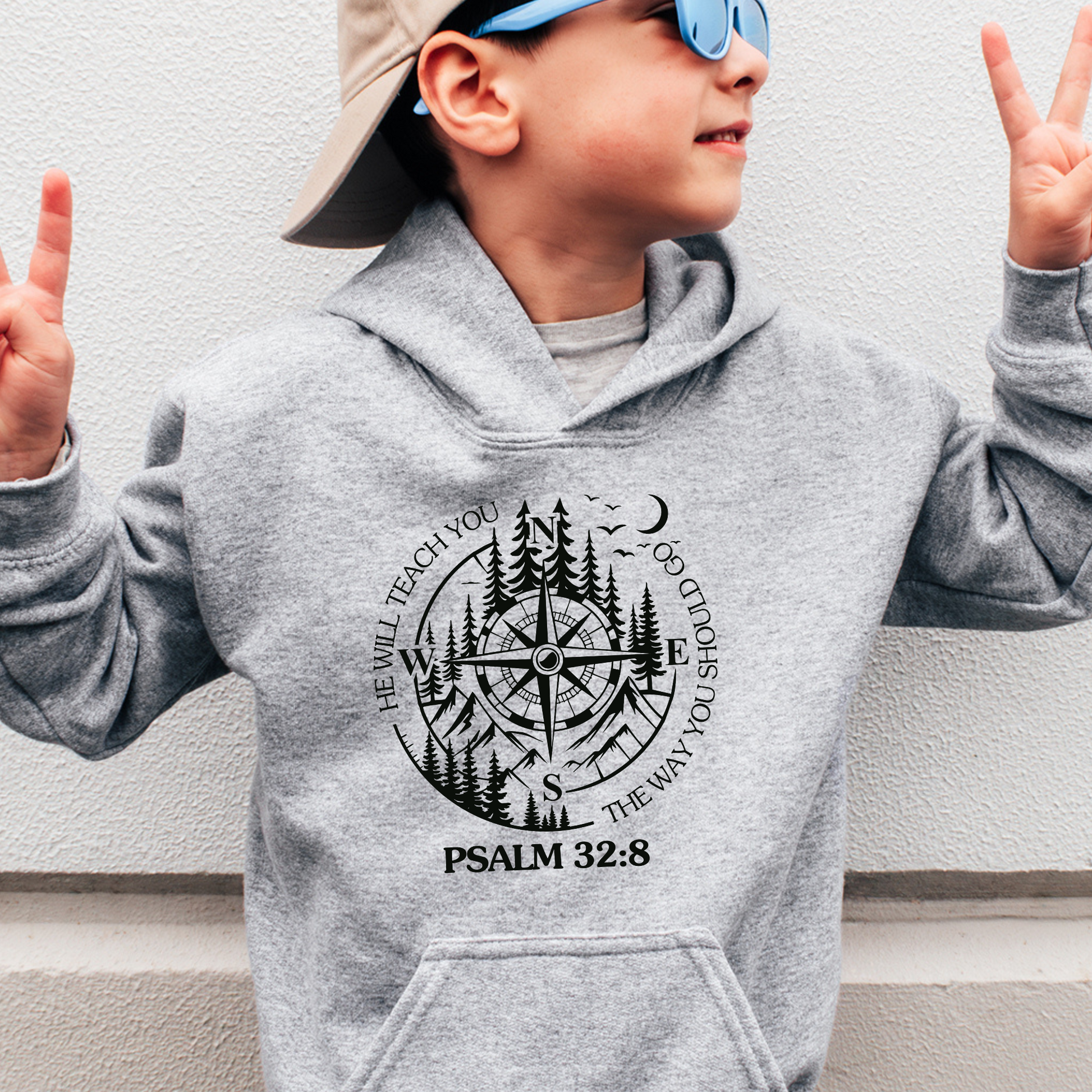 Let your little one wear a reminder that God is always guiding their steps. This cozy gray hoodie features a bold compass design surrounded by mountains, trees, and the promise of Psalm 32:8: “He will teach you the way you should go.”